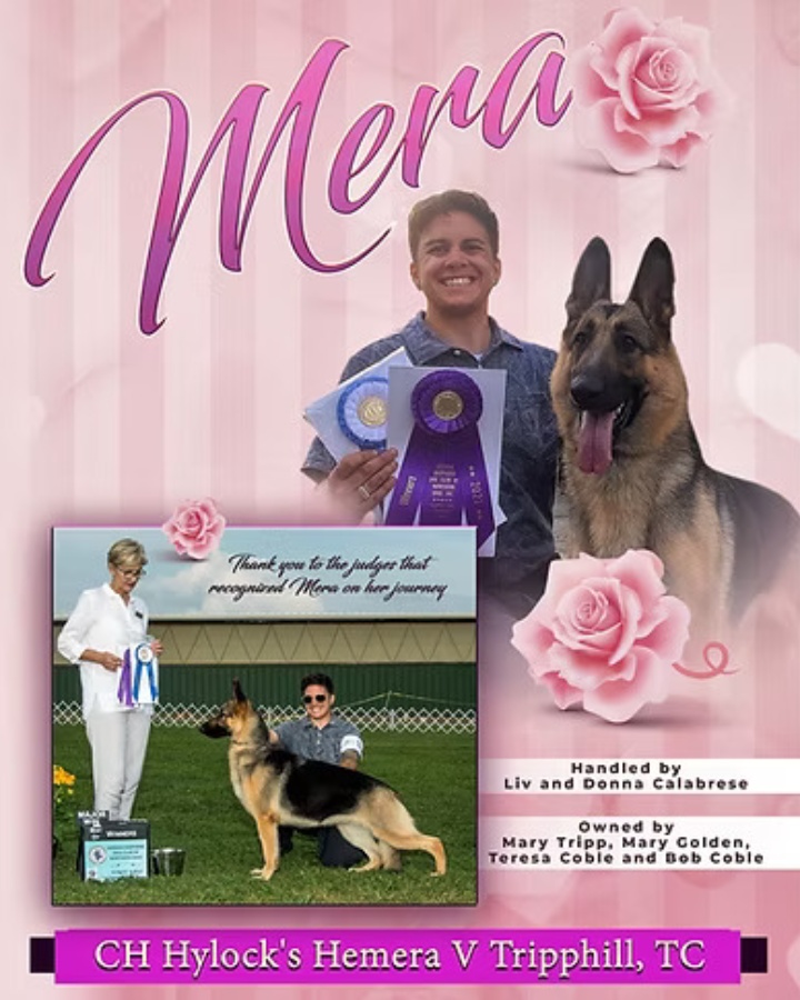 Her OFA and CHIC certifications demonstrate a commitment to sound genetics, while her TC title highlights her stable temperament and working aptitude. Intelligent, confident, and attentive, Mera thrives in structured environments and forms deep bonds with her handlers and family.