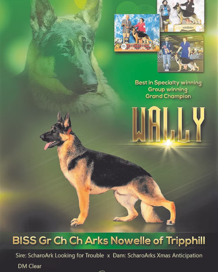 Wally is a BISS, Group-winning Grand Champion German Shepherd Dog known for correct structure, balanced movement, and a confident, stable temperament. He is sired by ScharoArk Looking for Trouble and out of SilverGfans CH Ark’s Nowelle of Tripphill, OFA, TC, combining proven bloodlines with consistent quality.