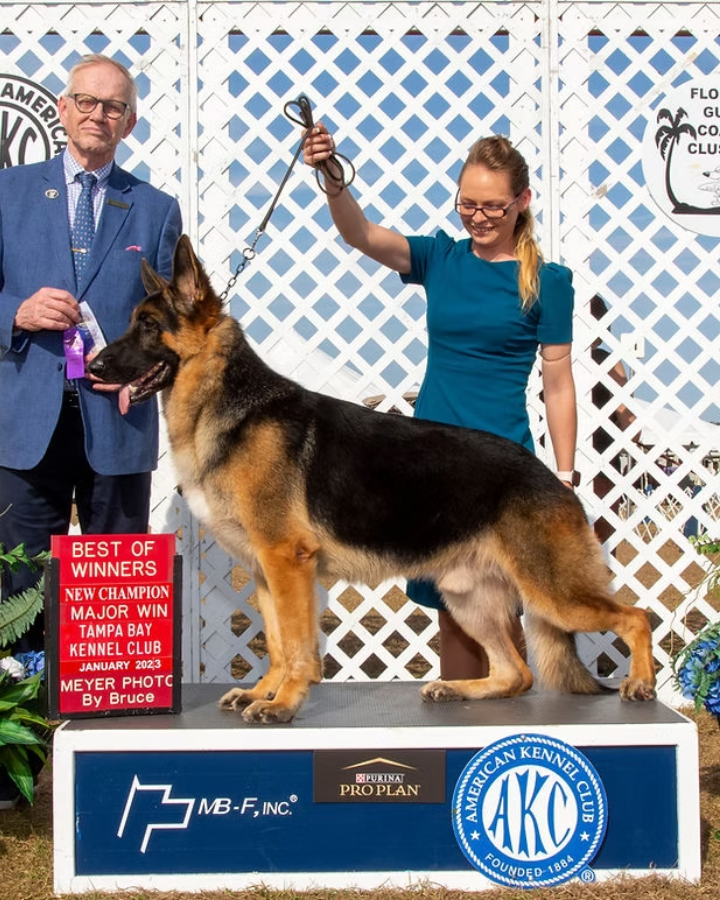 Roper is a stunning male German Shepherd Dog (GSD), proudly carrying the pedigree CH Tripphill’s The Devil’s Rope V Loehwind TC. A true show champion, he earned Best of Winners, New Champion, and a Major Win at the Tampa Bay Kennel Club in January 2023. Recognized by the AKC and sponsored by Purina Pro Plan and MB-F, Inc., Roper exemplifies strength, structure, and breed excellence.